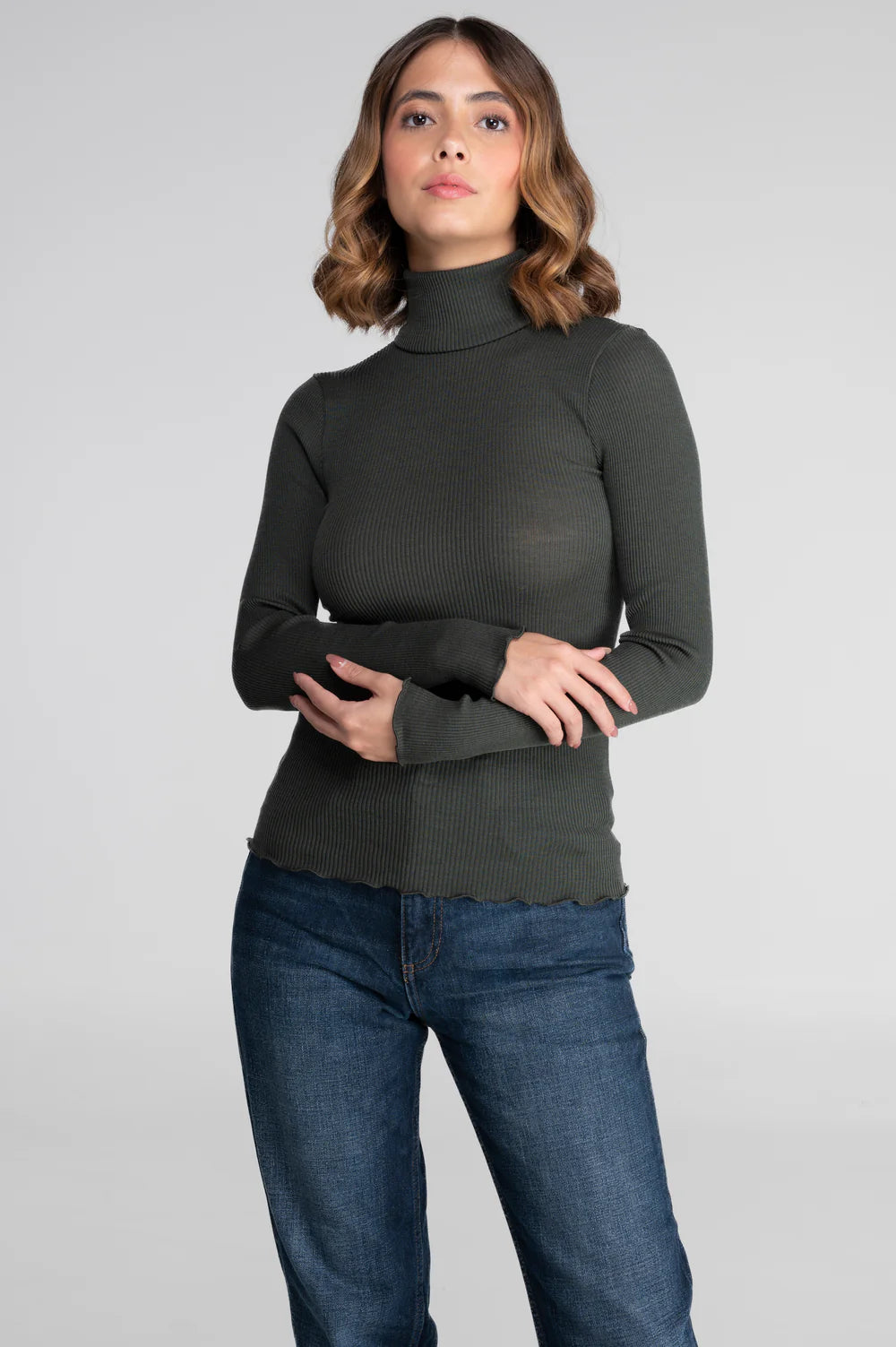 Pull col roulé en laine mérinos et soie Roma Vert Bosco - 2 est en rupture de stock et sera envoyé dès qu'il sera disponible